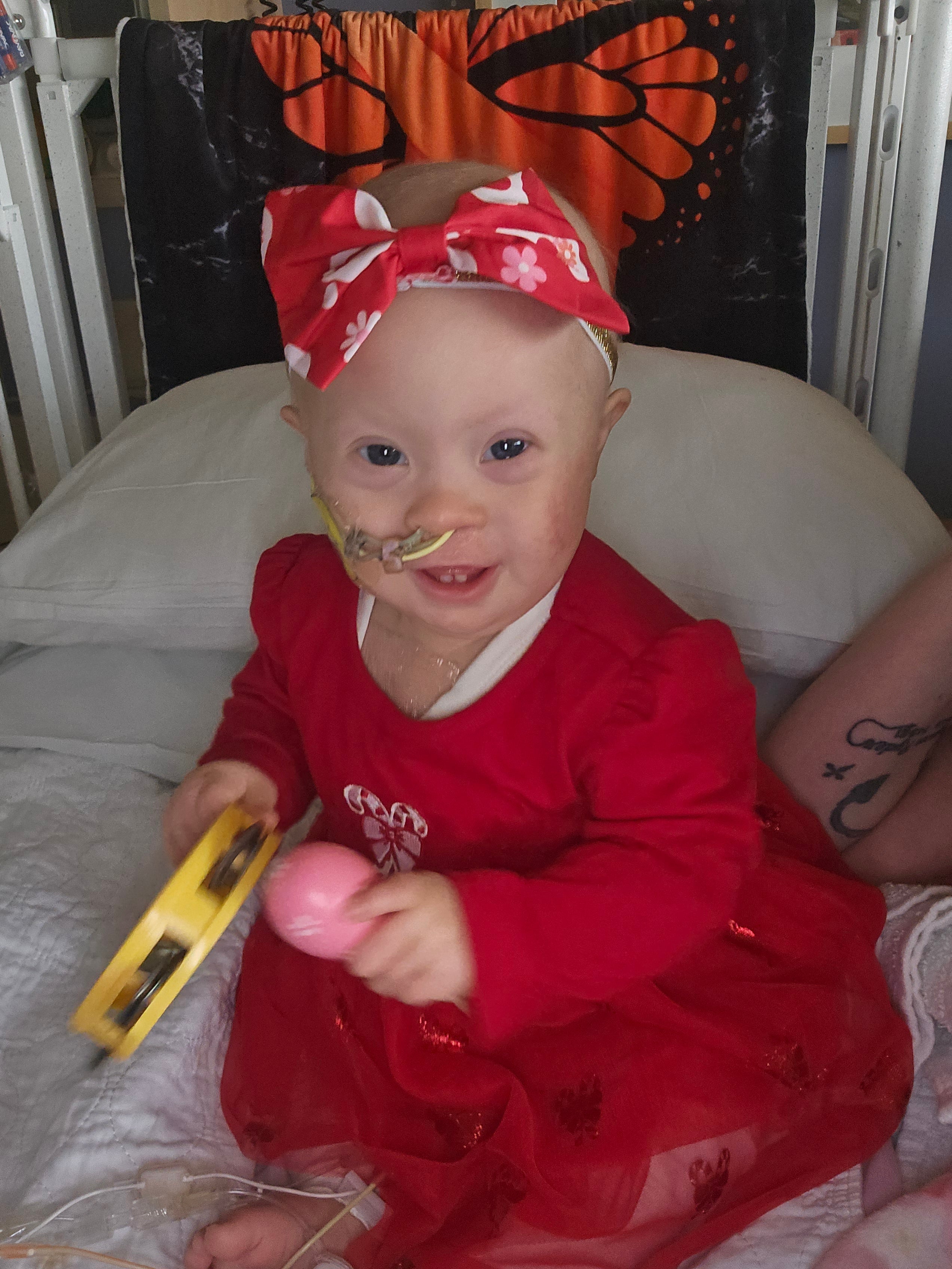 "Our daughter Sophia is 16 months and currently battling Acute Myeloid Leukemia. She was diagnosed days after her 1st birthday back at the end of July. Her entire nursery theme has been the little mermaid and the only way she will sleep is falling asleep to the Little Mermaid "Under the Sea". She also has down syndrome and is the most incredible little girl. Despite everything she has endured, she has learned how to sit up all on her own, started crawling, and even trying to stand/take steps all while being in the hospital hooked up head to toe from her IVs and feeding tubes. She's such an incredible little girl! We are currently at UW American Family Children's hospital in Madison, WI and each of her chemo treatments are at minimum a 28 day stay here. We've been in the hospital currently almost 100 days and counting, with only a week at best in between at home after each cycle. We are currently in remission, thank the Lord, and still have 2 more of chemo treatments to go!"